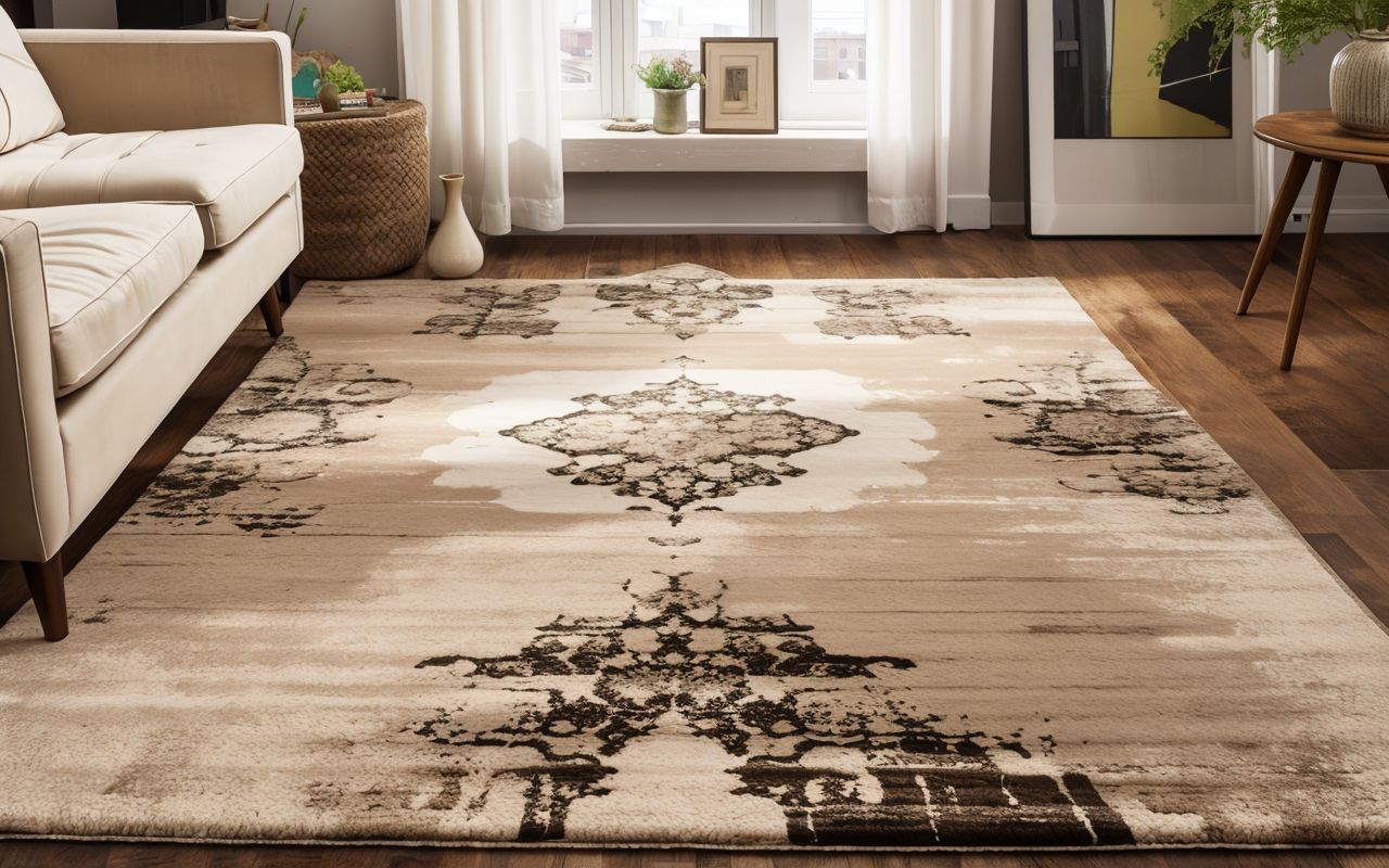 - Определите размер ковра под площадь и назначение. Для гостиной лучше выбирать ковры среднего размера, а для прихожих или кухонь — небольшие изделия.