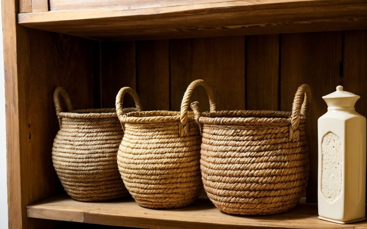 Соломенные корзины, в свою очередь, представляют собой плетёные изделия из высушенных стеблей злаковых растений. За счет легкости и гибкости материала корзины удобно размещаются на полках, служат для хранения мелких предметов и добавляют интерьеру уют.