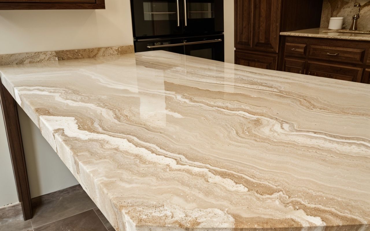 Для максимальной натуральности используют несколько оттенков – светлых, теплых и прохладных тонов, а также интеграцию темных прожилок, имитирующих природные включения травертина.