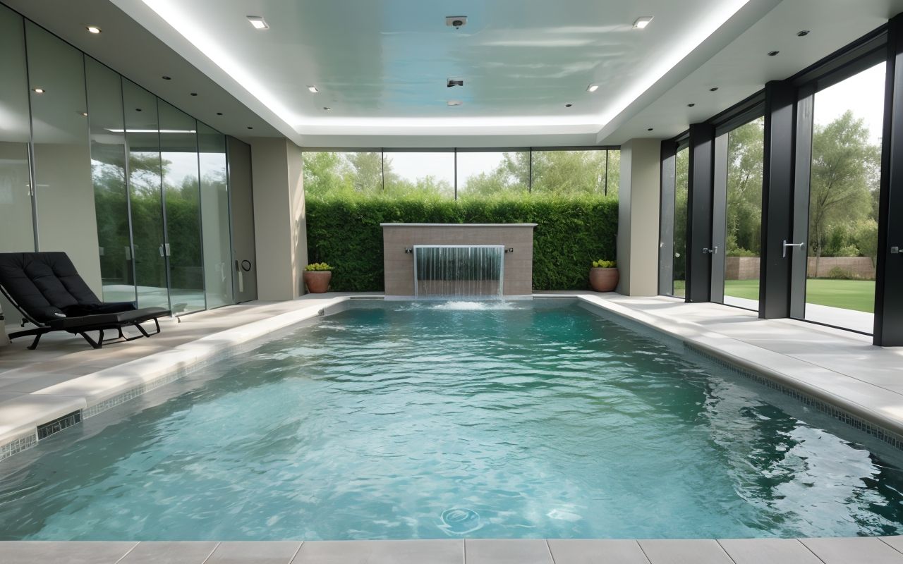 Стеклянные панели используются в качестве элемента отделки, придающего бассейну современный вид. Гидрофобные покрытия наносятся на стены и дно бассейна, создавая защитный барьер от воды и грязи, облегчая уход и повышая долговечность.